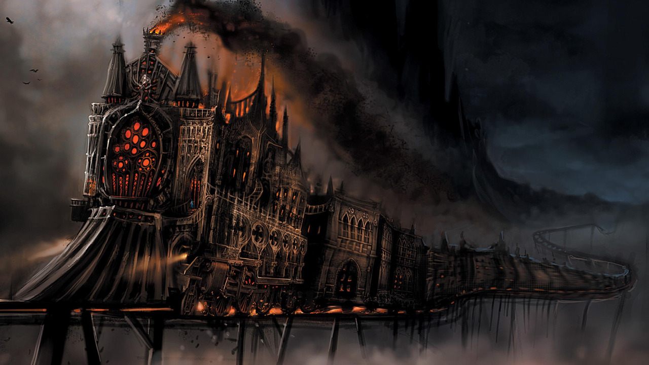 Infernal Train resembling a neverending, hellish convoy of gothic city